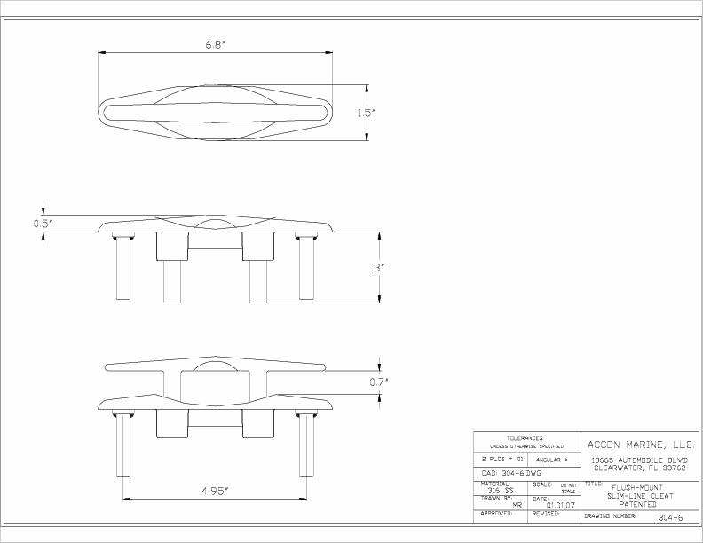 * Sleek, narrow design allows for installation where other flush-mounted cleats won't fit.
